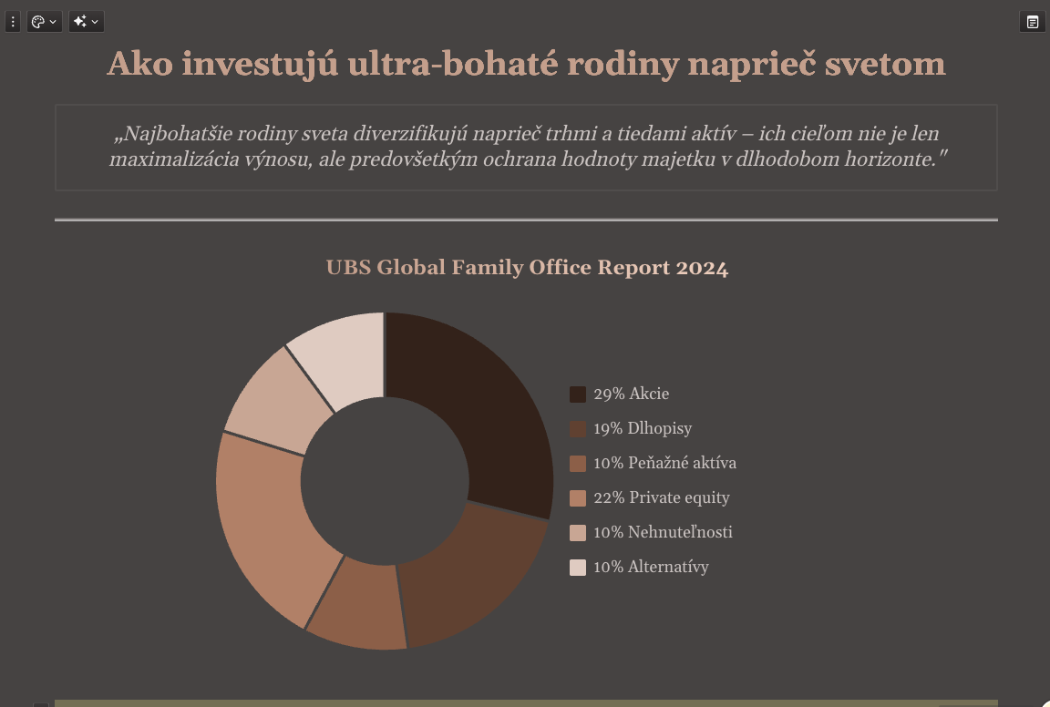 Väčšina bonitných rodín a investorov má majetok rozdelený medzi viacero foriem a inštitúcií. Časť je uložená v nehnuteľnostiach, časť na účtoch v rôznych bankách, niekedy vo vlastných firmách, a ďalšia časť v investičných riešeniach, ktoré vznikali postupne v rôznych obdobiach. Výsledkom býva neprehľadná štruktúra a rozhodovanie podľa aktuálnych ponúk, nie na základe uceleného plánu. Skutočná správa majetku si pritom vyžaduje presný opak – systém a nadhľad.