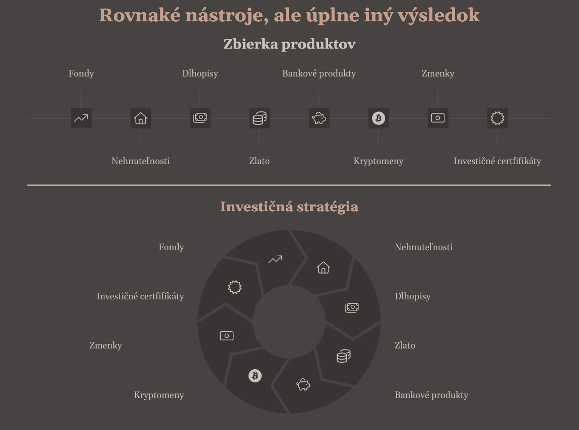 Skúsme sa na portfólio pozrieť ako na stavbu domu. Mnohí investori sa snažia o diverzifikáciu tak, že vlastnia veľa rôznych nástrojov (tehál). Problémom však často nie je to, čo vlastníme, ale fakt, že tieto prvky spolu nedávajú vždy zmysel. Investície existujú vedľa seba, ale nie sú súčasťou jedného premysleného celku.